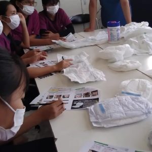 今日は、アルバイト留学生の皆さんへオムツメーカーの担当者よりオムツ使用のレクチャーを実施しました。