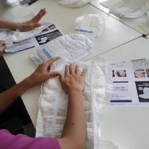 オムツのあて方を練習します。利用者の気持ちに寄り添うためにオムツをあてて体感します。