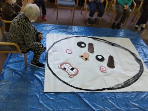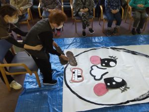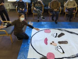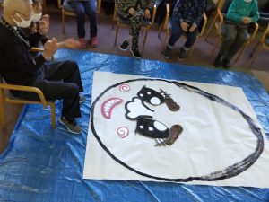 大きな福笑いに囲みながら、「がんばれ」」と声を掛け合い、